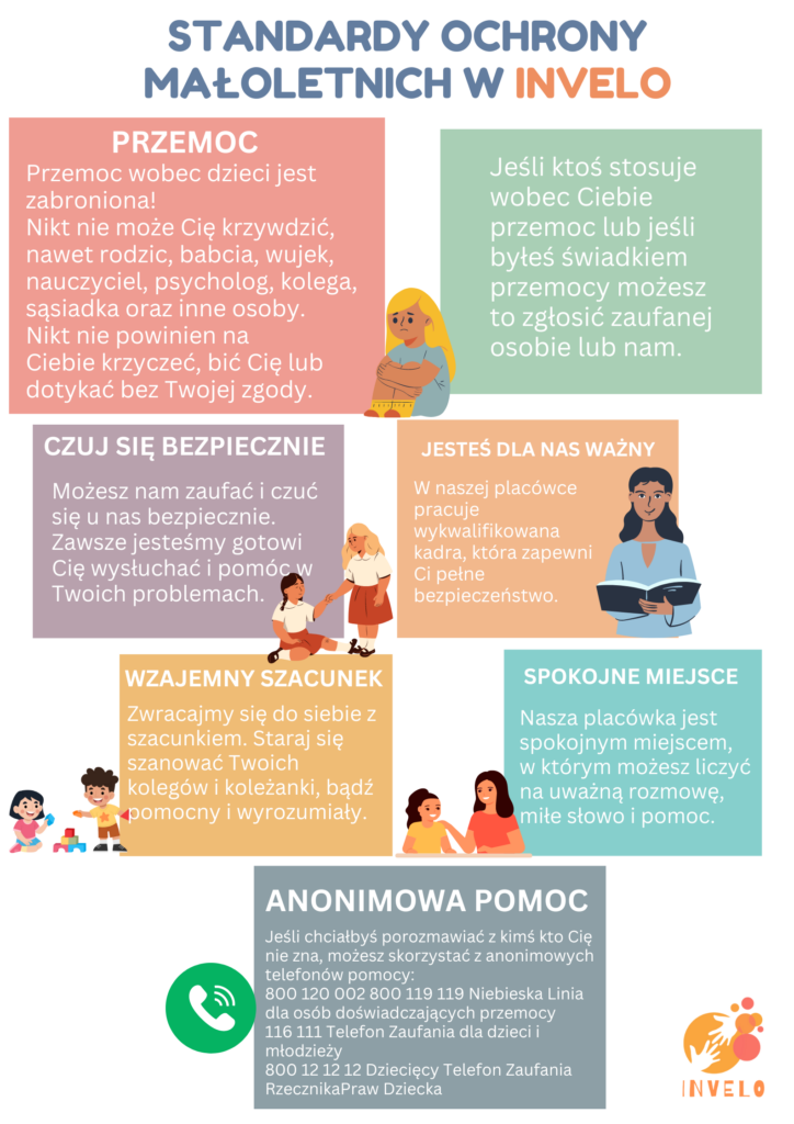W Invelo staramy się zapewnić bezpieczeństwo wszystkim naszym podopiecznym. Nasza placówka wprowadziła Standardy ochrony małoletnich które obowiązują wszystkich pracowników.
